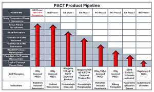 The active IND/IDE therapeutic pipe includes treatments for radiation induced xerostomia, Sjogren’s or GVHD induced xerostomia, hematologic disorders in children and young adults, and hematologic cancers. PACT’s pre-clinical work includes further studies for radiation induced xerostomia, autoimmune diseases, pancreatic and ovarian cancer treatments.